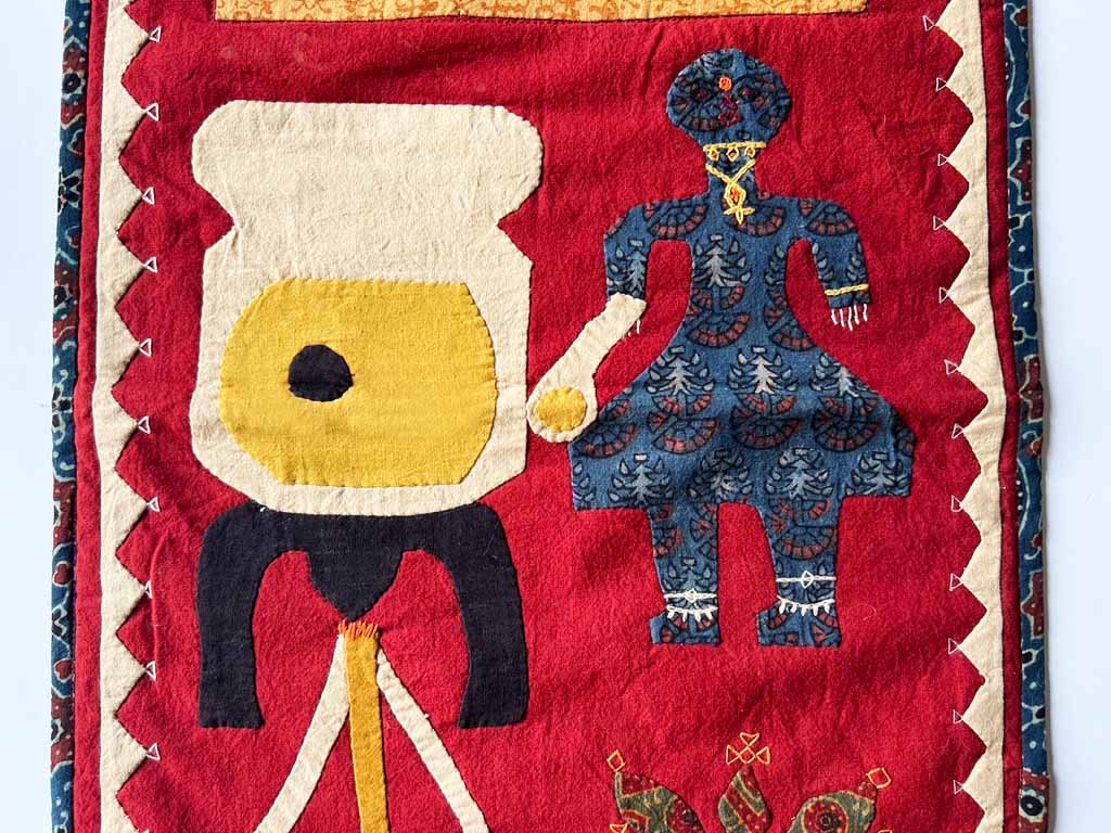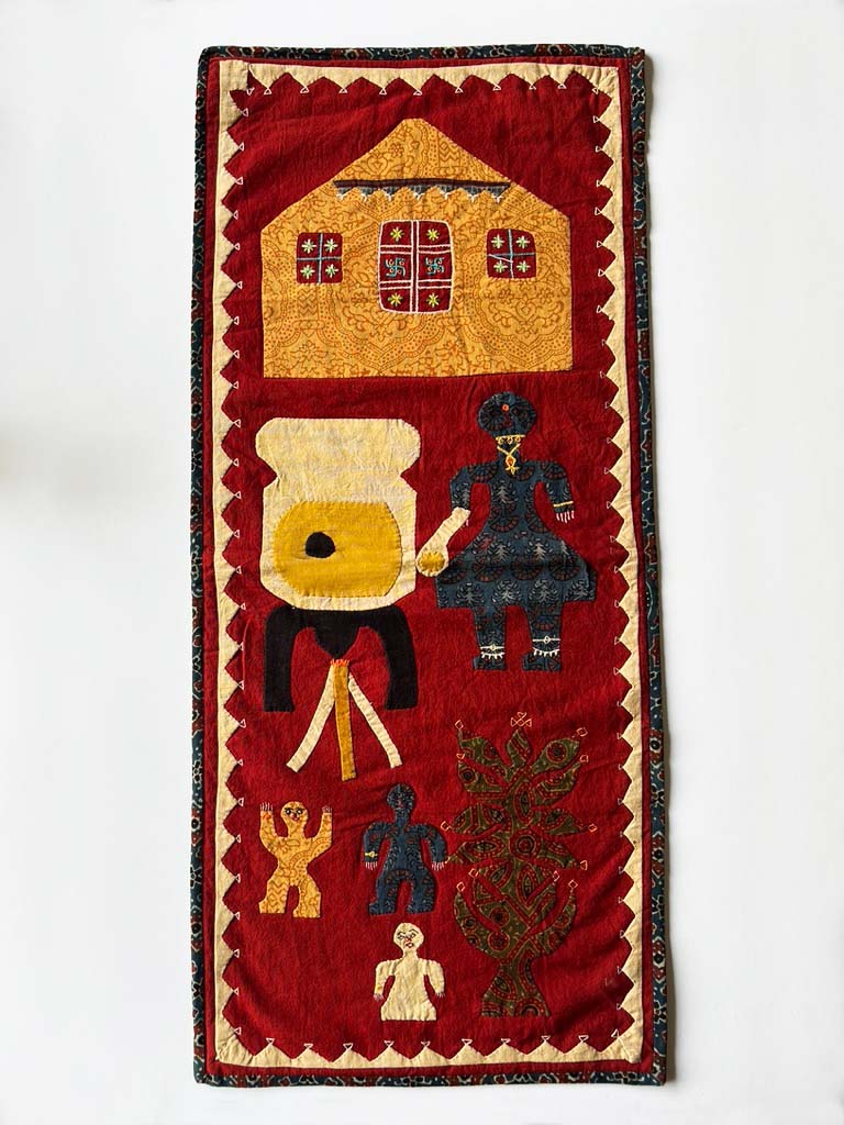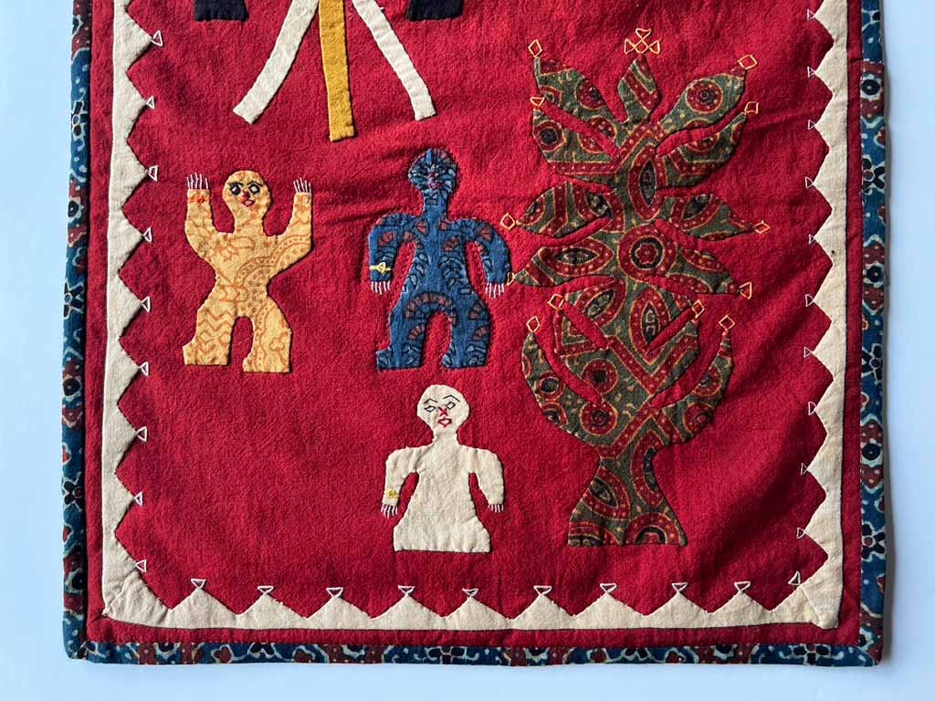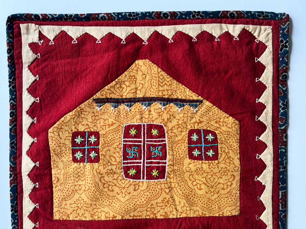 This aplique wall hanging contains the swastika a traditinal Hindi religious sign that was peverted by the Nazis.
