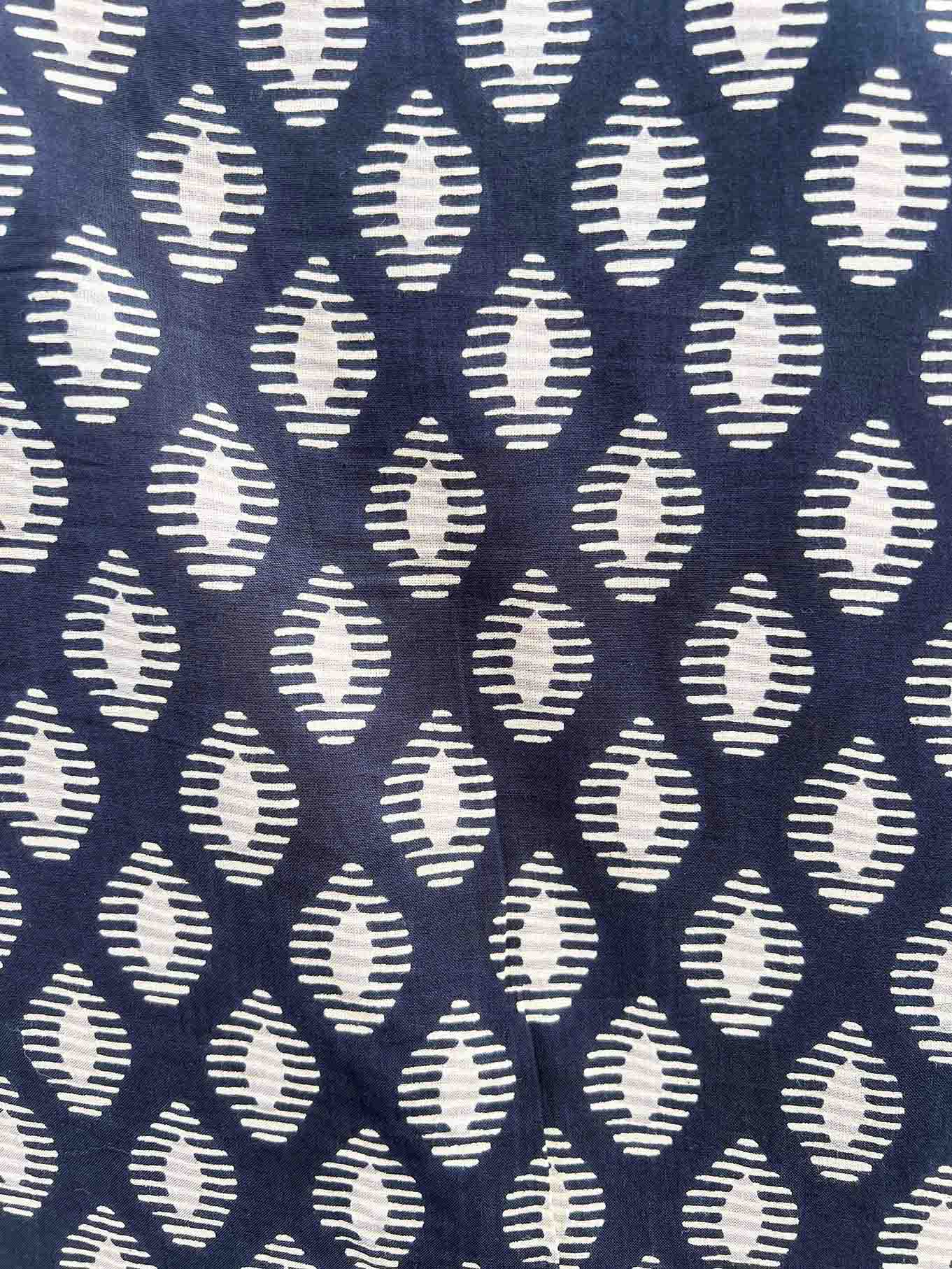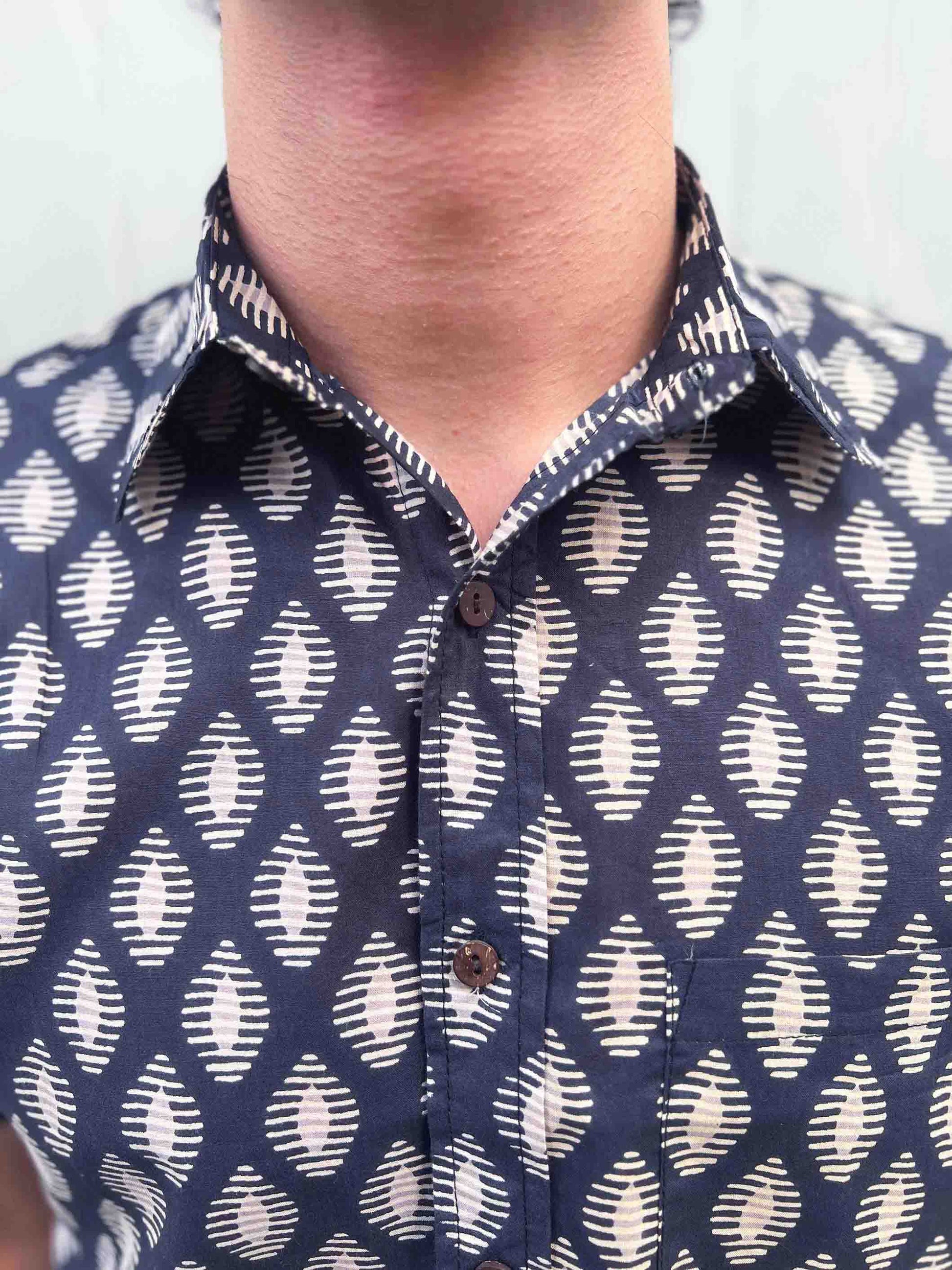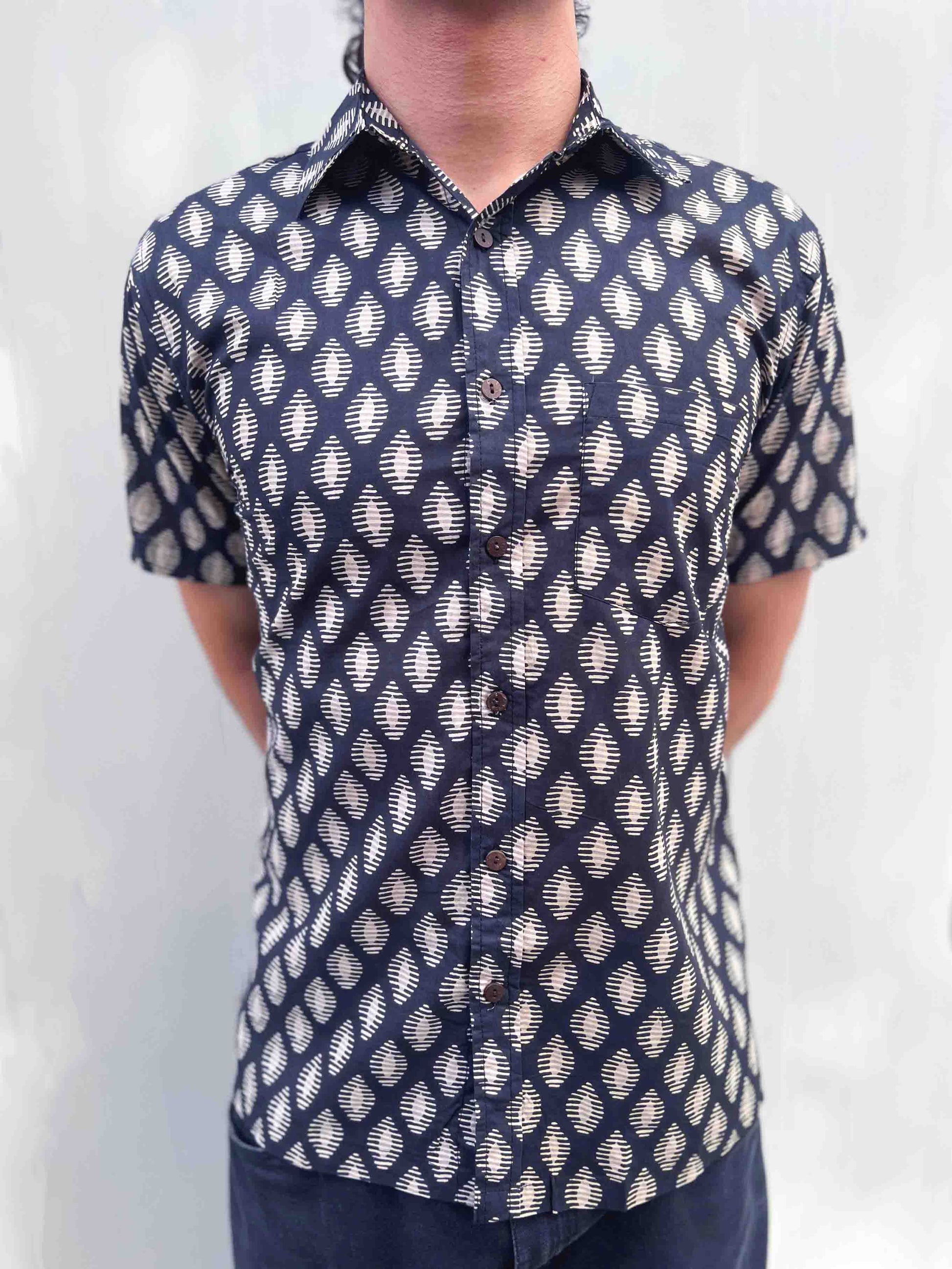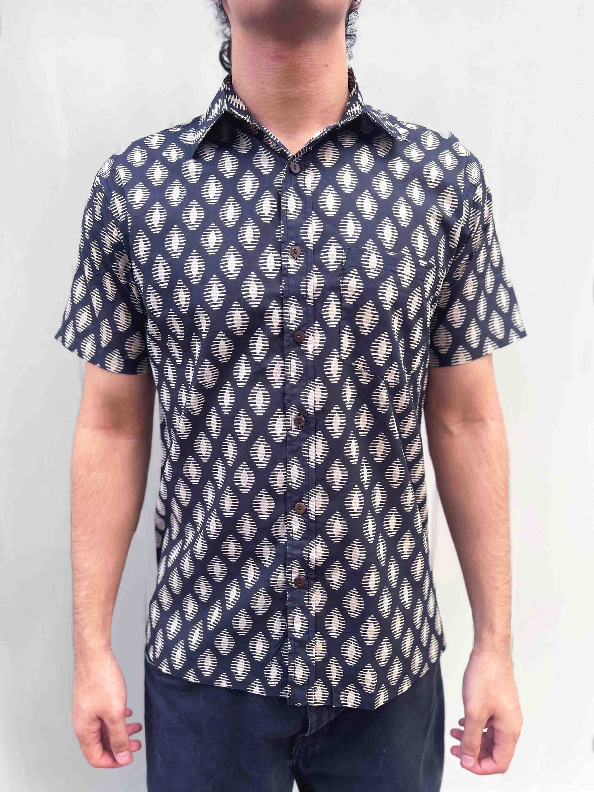 Screen printed short sleeved 100% cotton shirt with dark cocnut shell buttons. Deniz is 5' 10" and wears a medium.