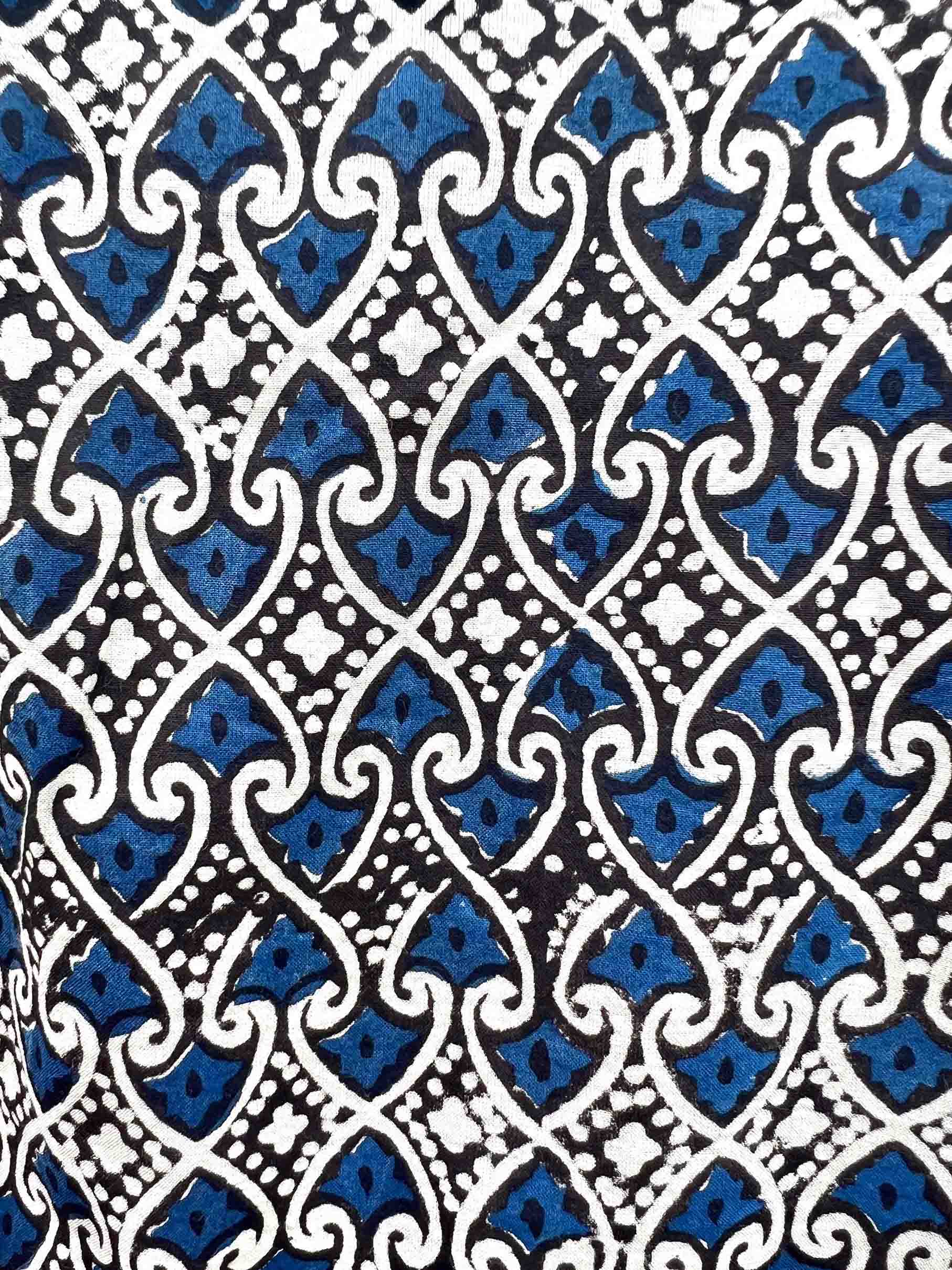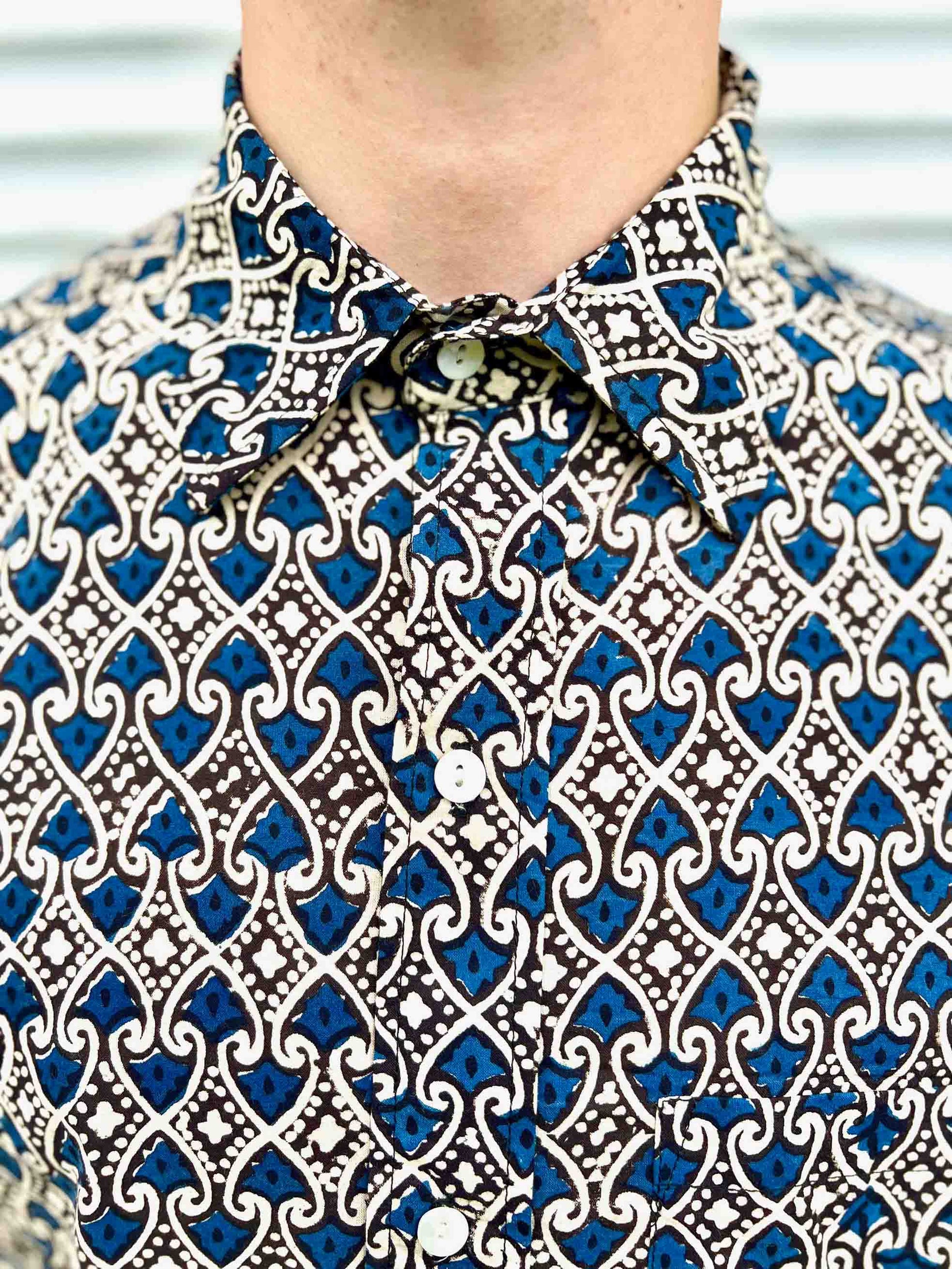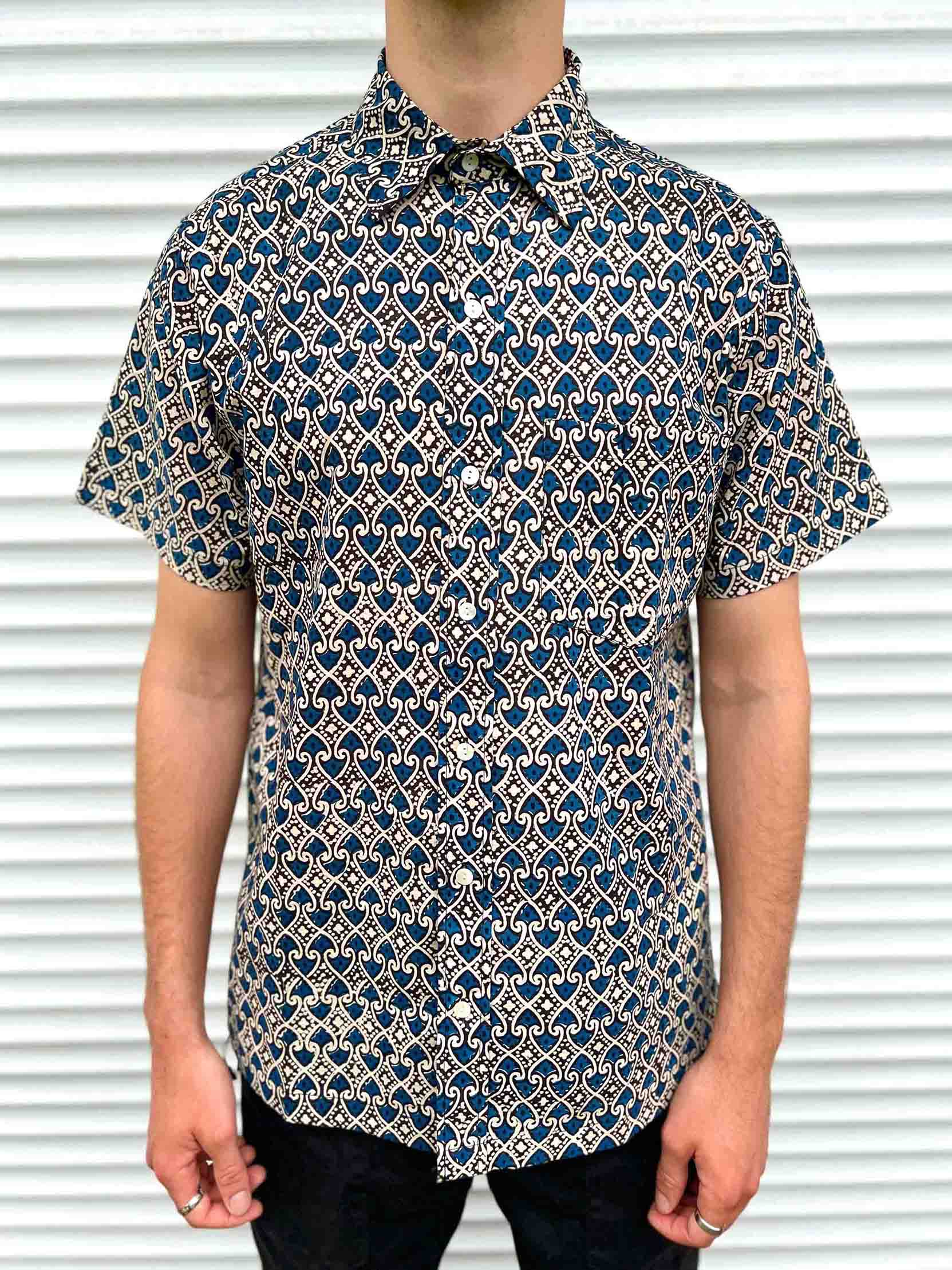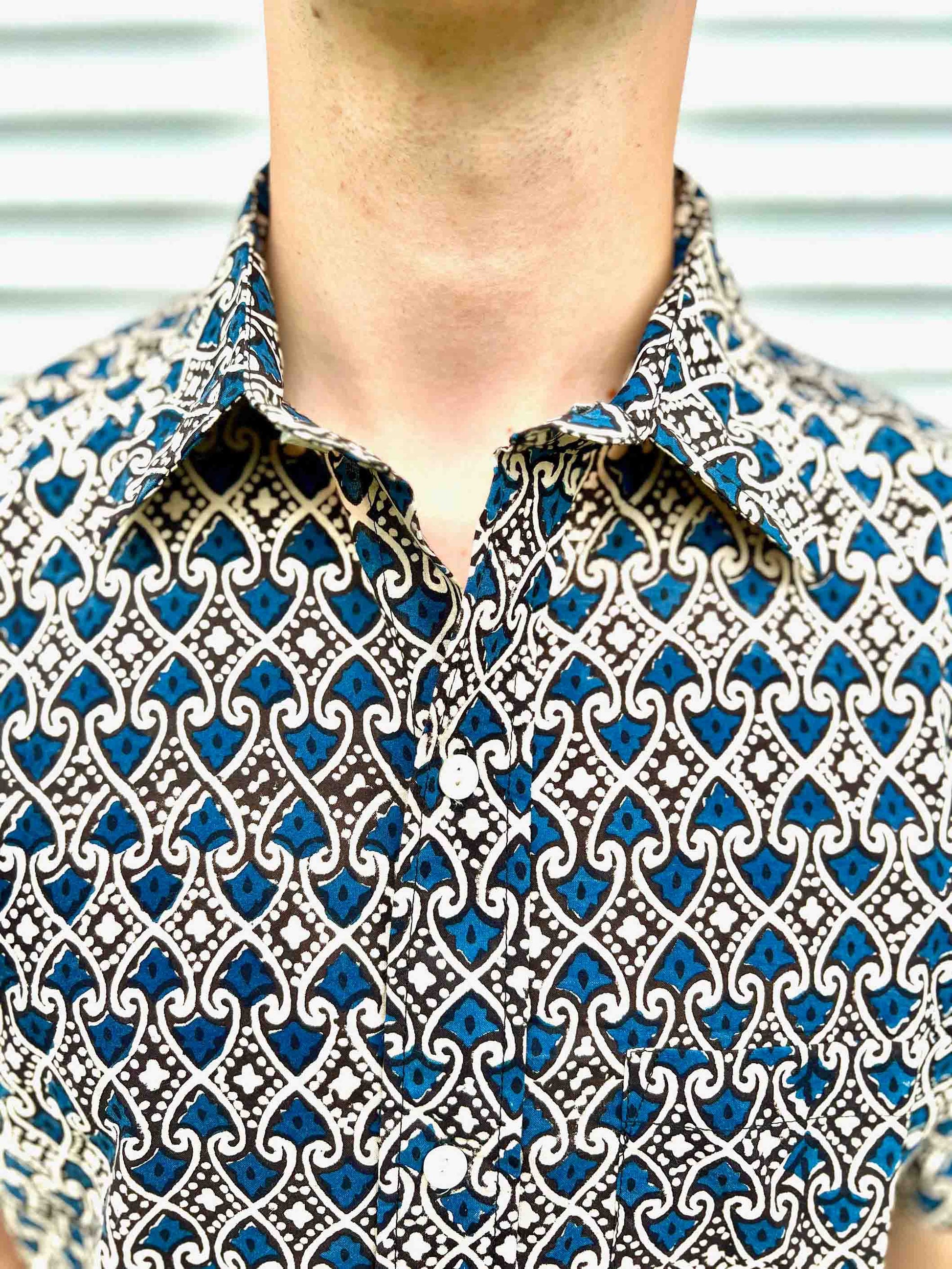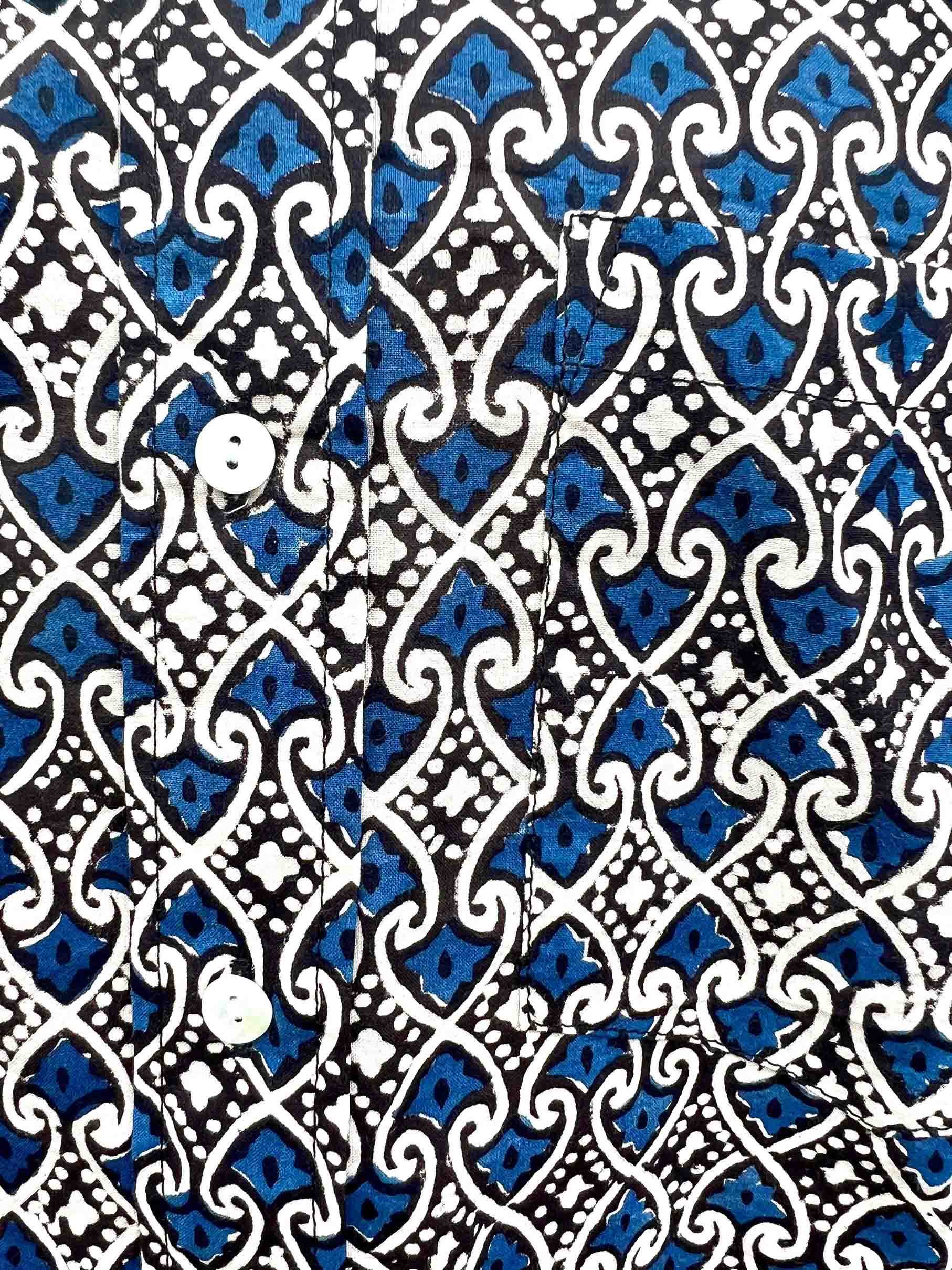 This is a traditionally hand block printed, short sleeved, 100% cotton shirt with white shell buttons. Luke is 6ft and wears a medium.