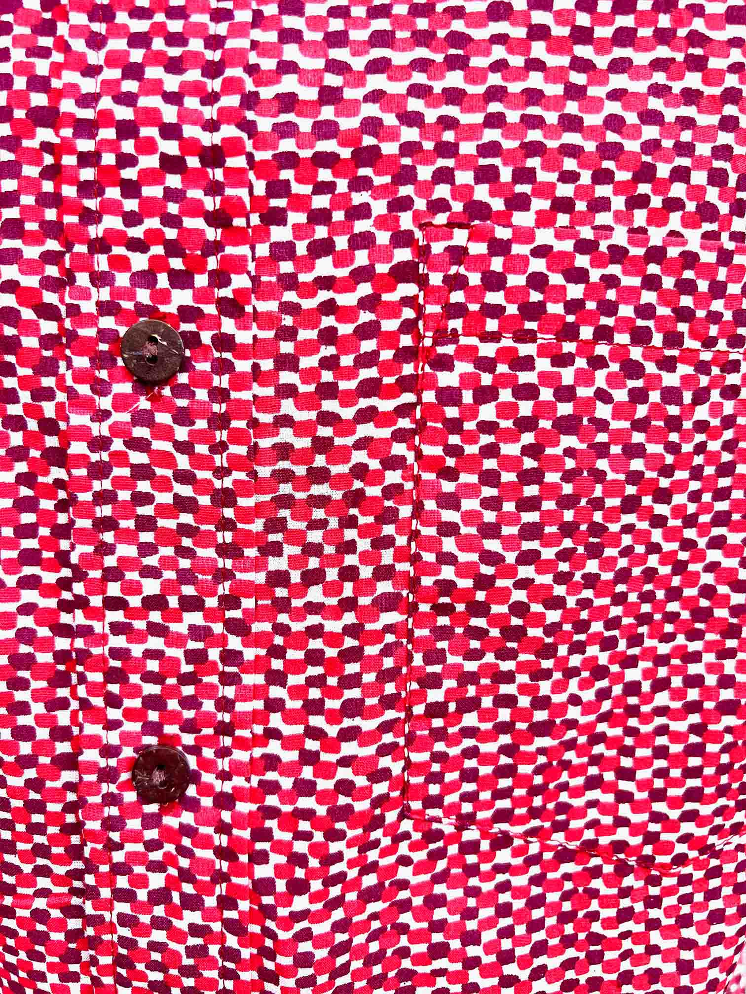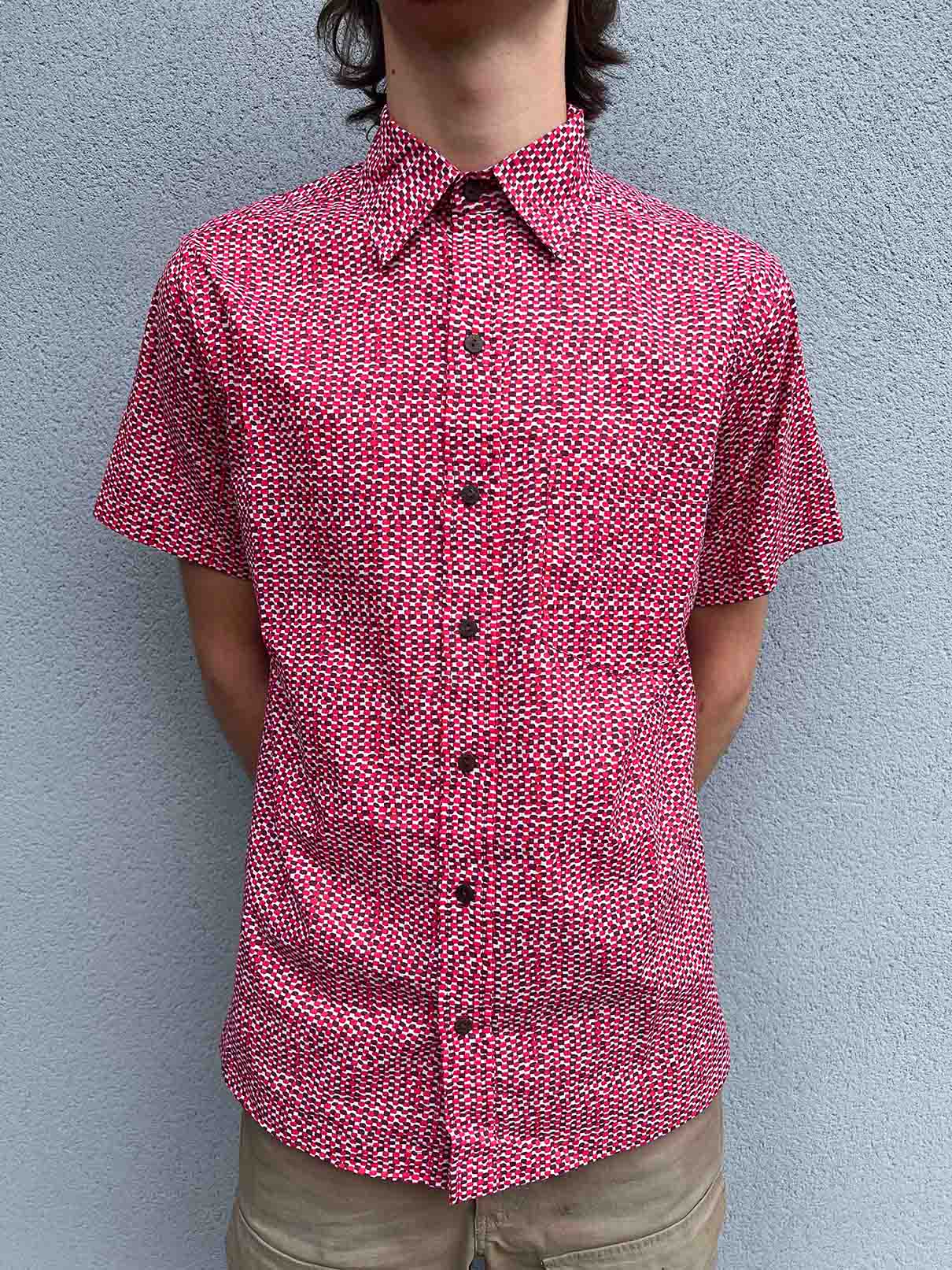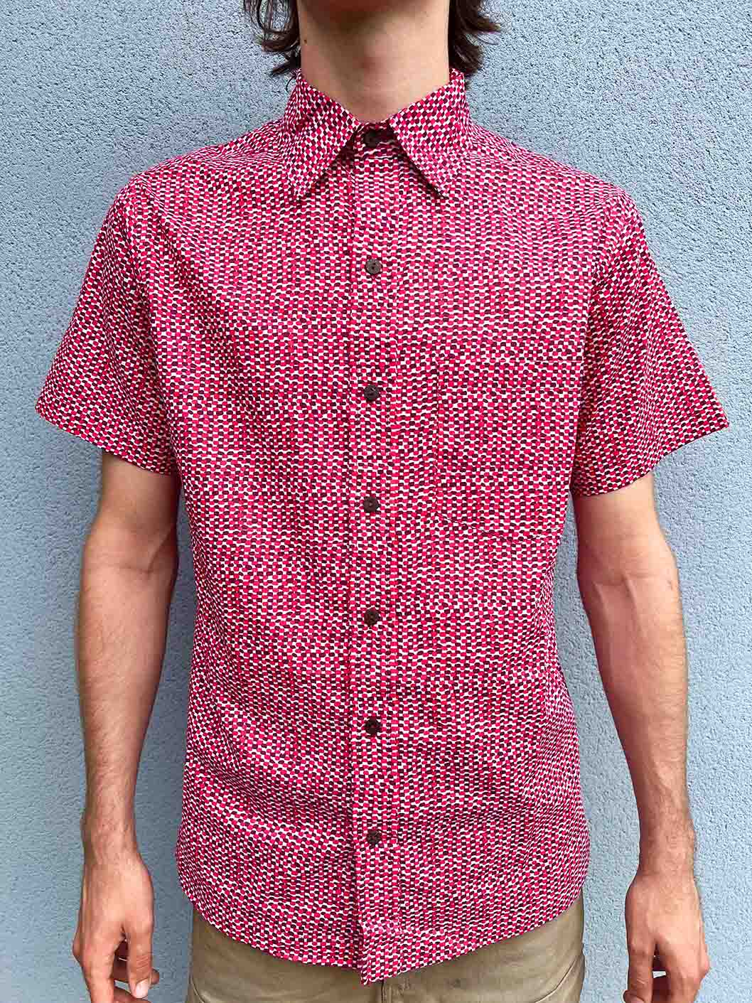 Screen printed short sleeved 100% cotton shirt with dark coconut shell buttons. Oscar is 6ft and wears a medium.