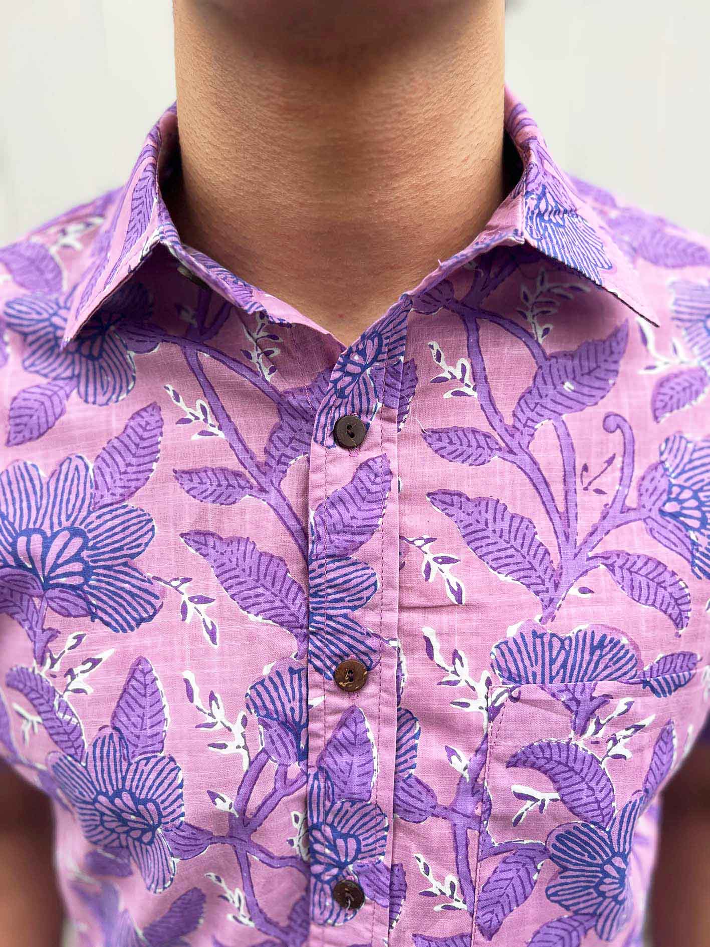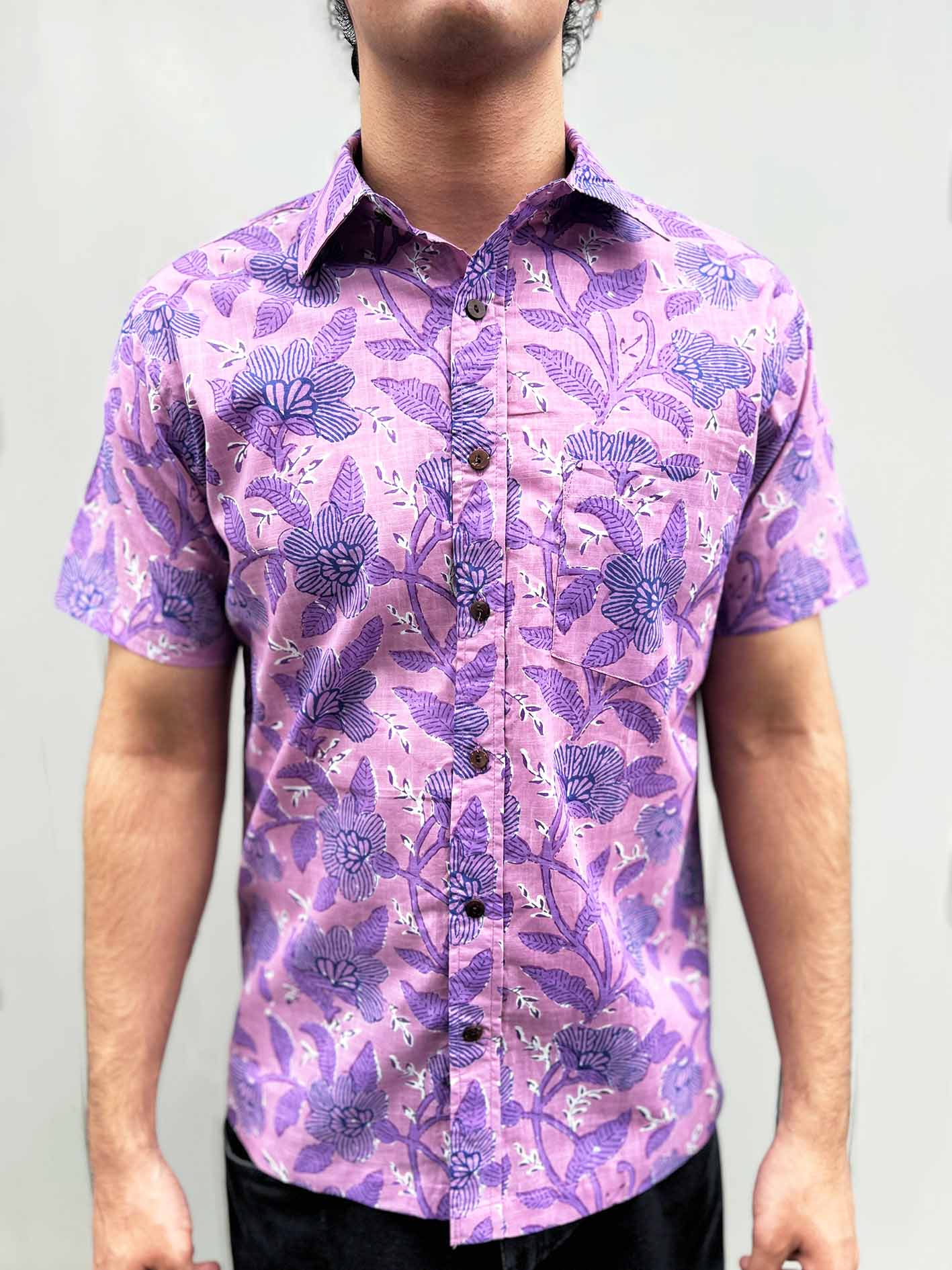 Screen printed short sleeved 100% cotton shirt with dark coconut shell buttons. Deniz is 5' 10" and wears a medium.