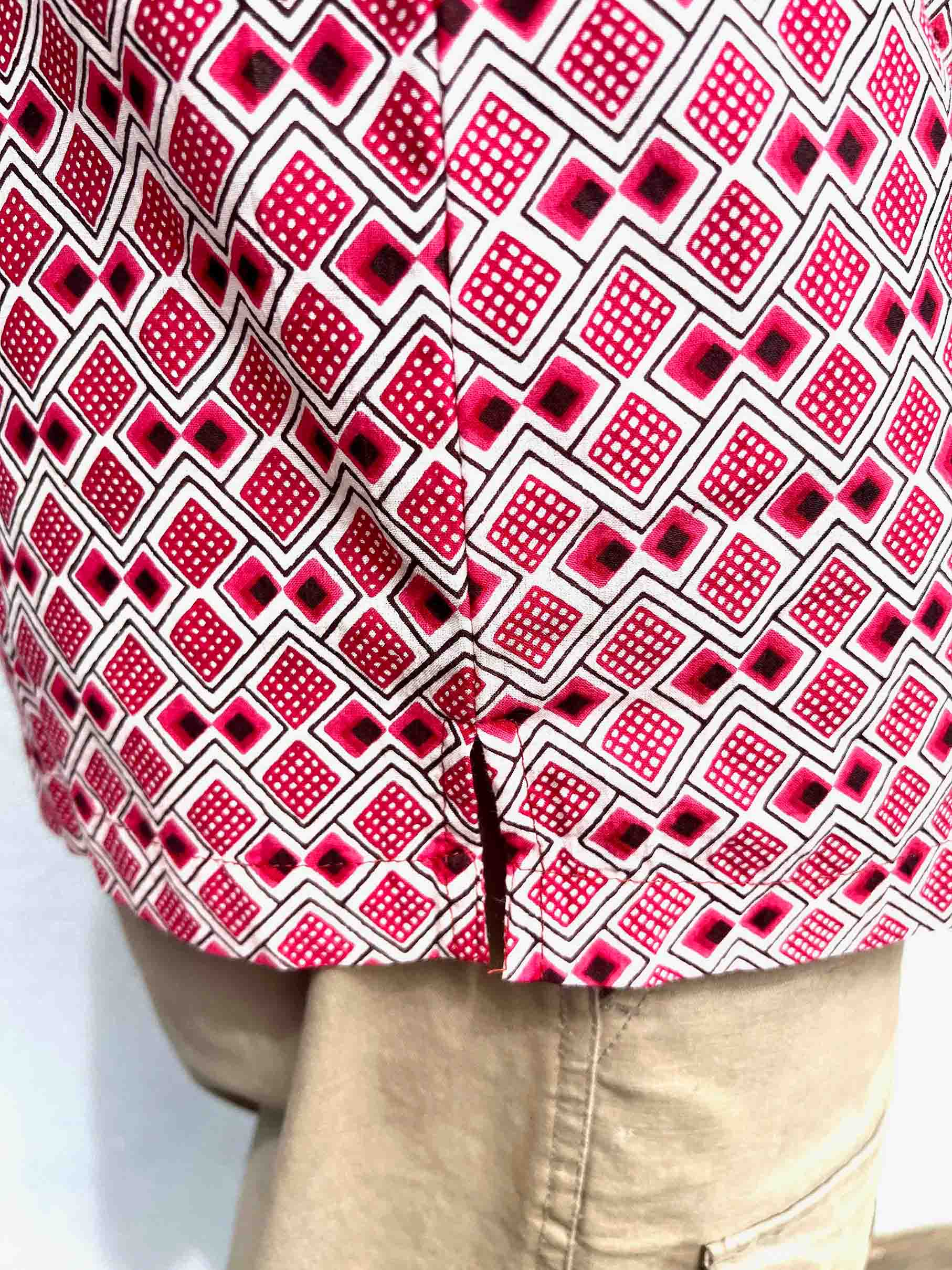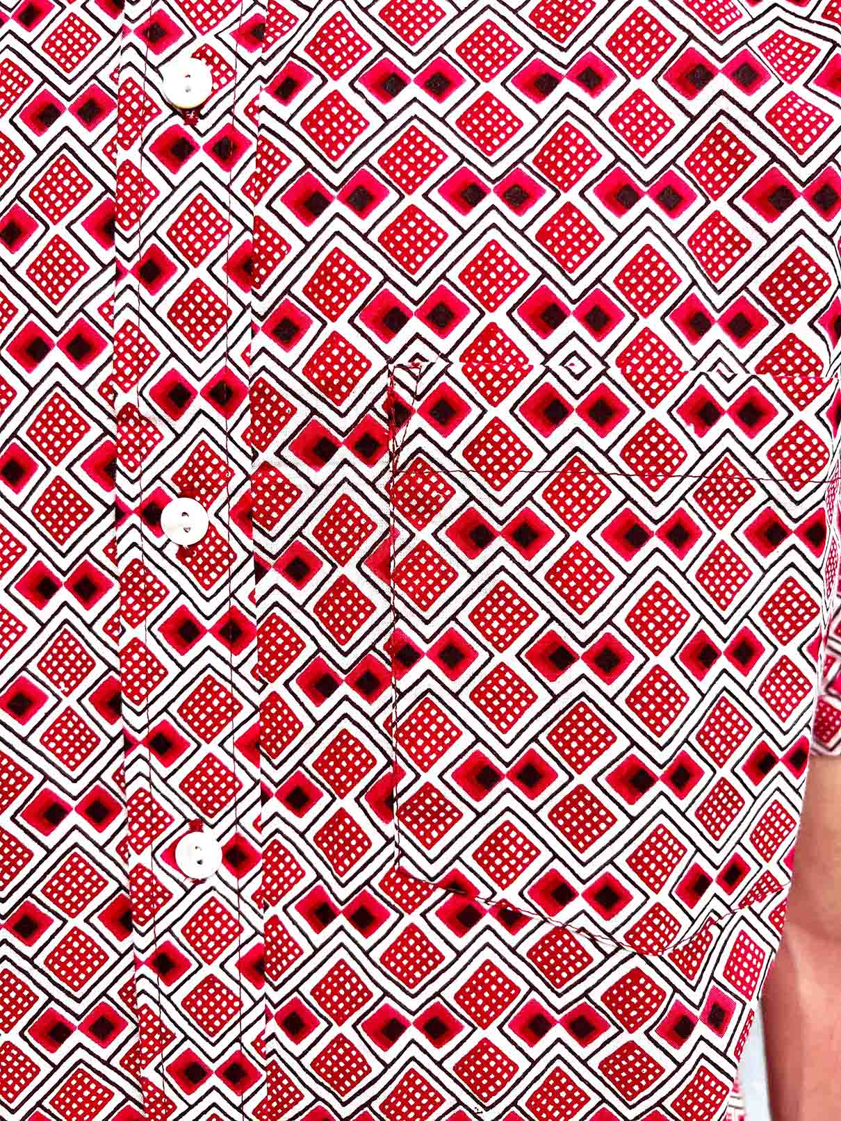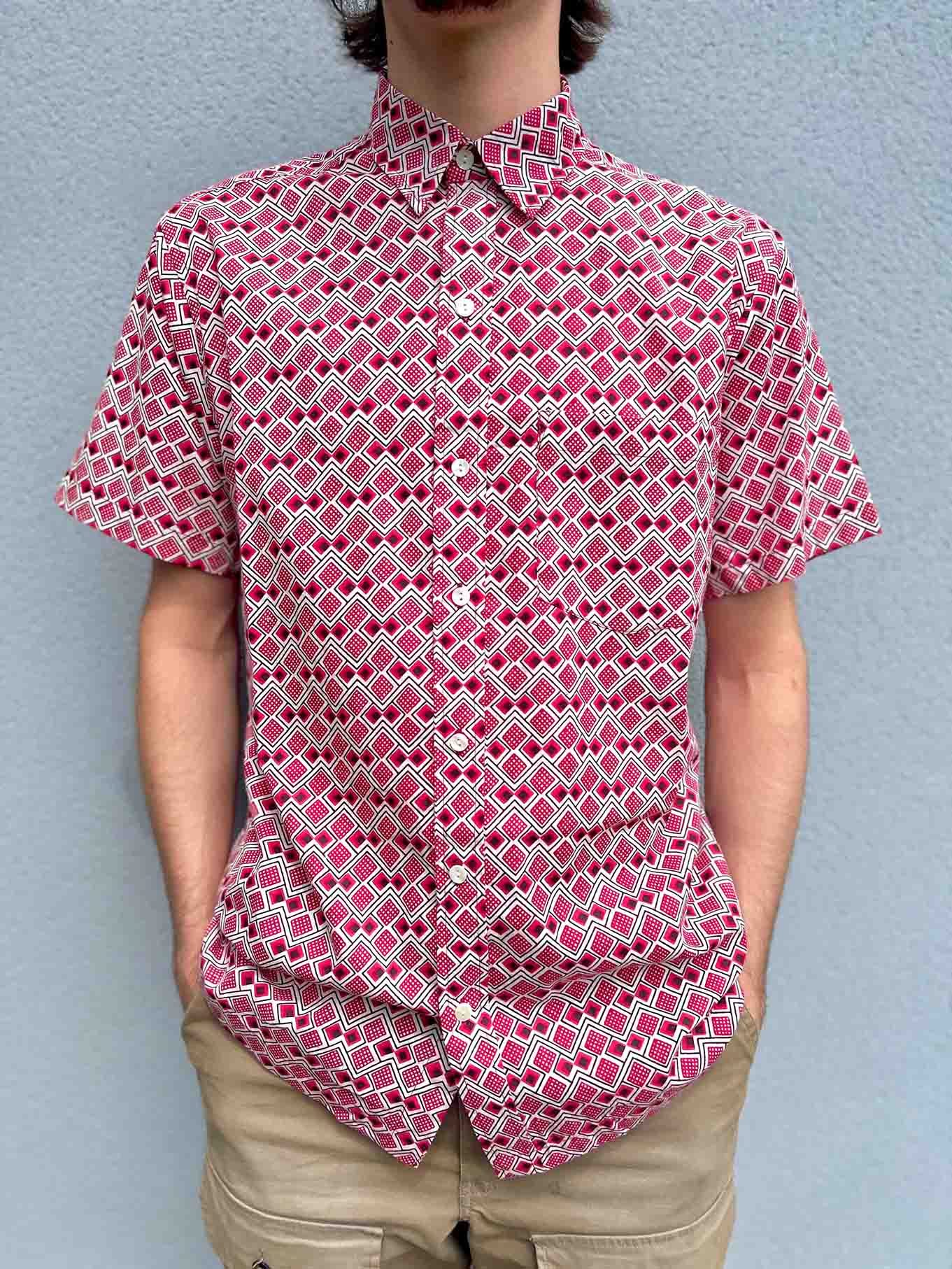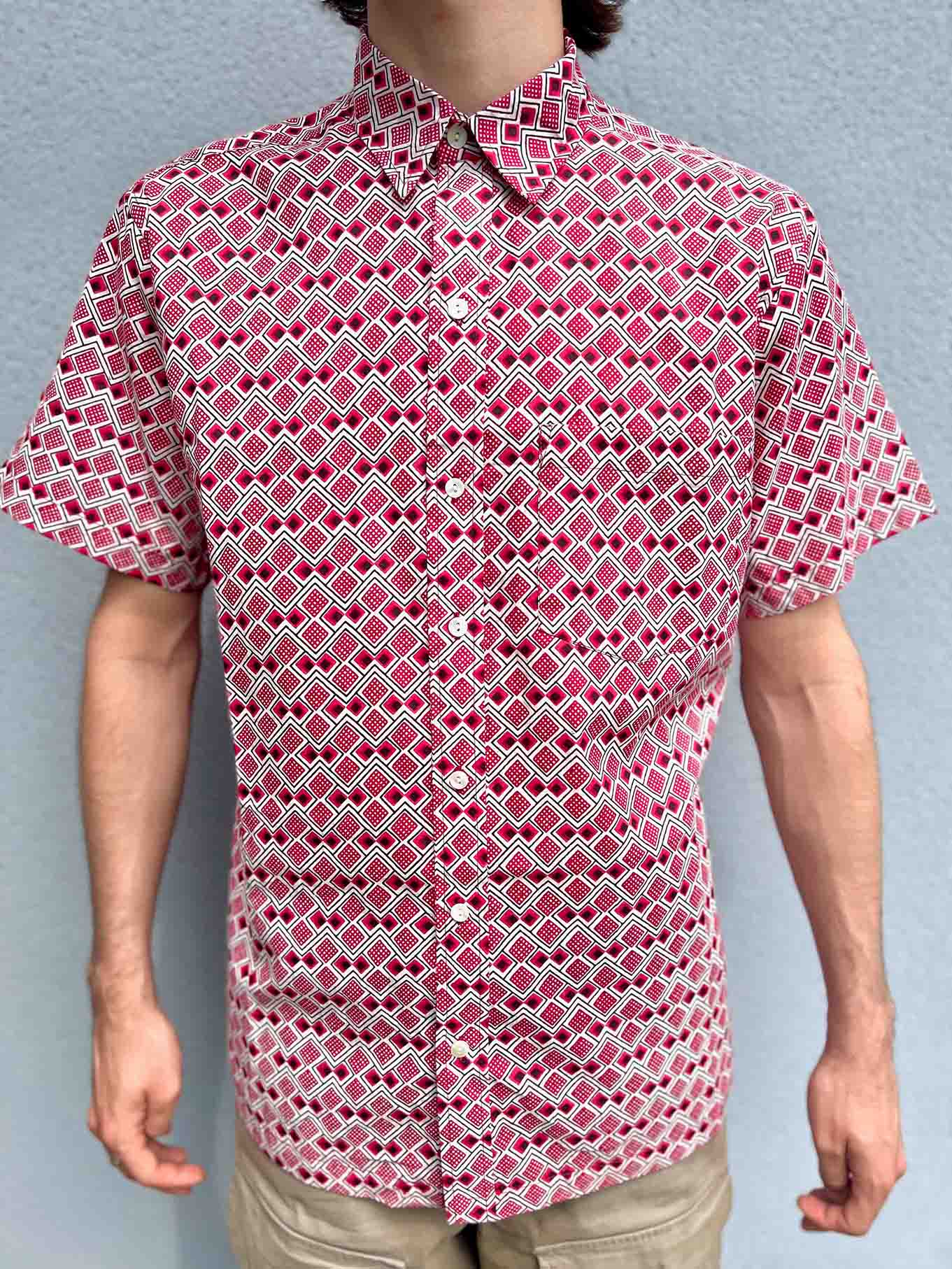 Screen printed short sleeved 100% cotton shirt with white shell buttons. Oscar is 6ft and wears a medium.