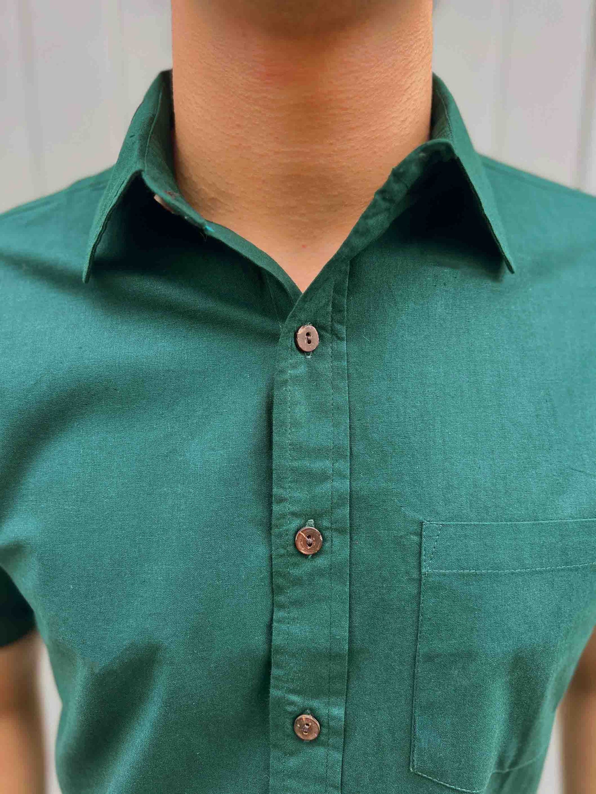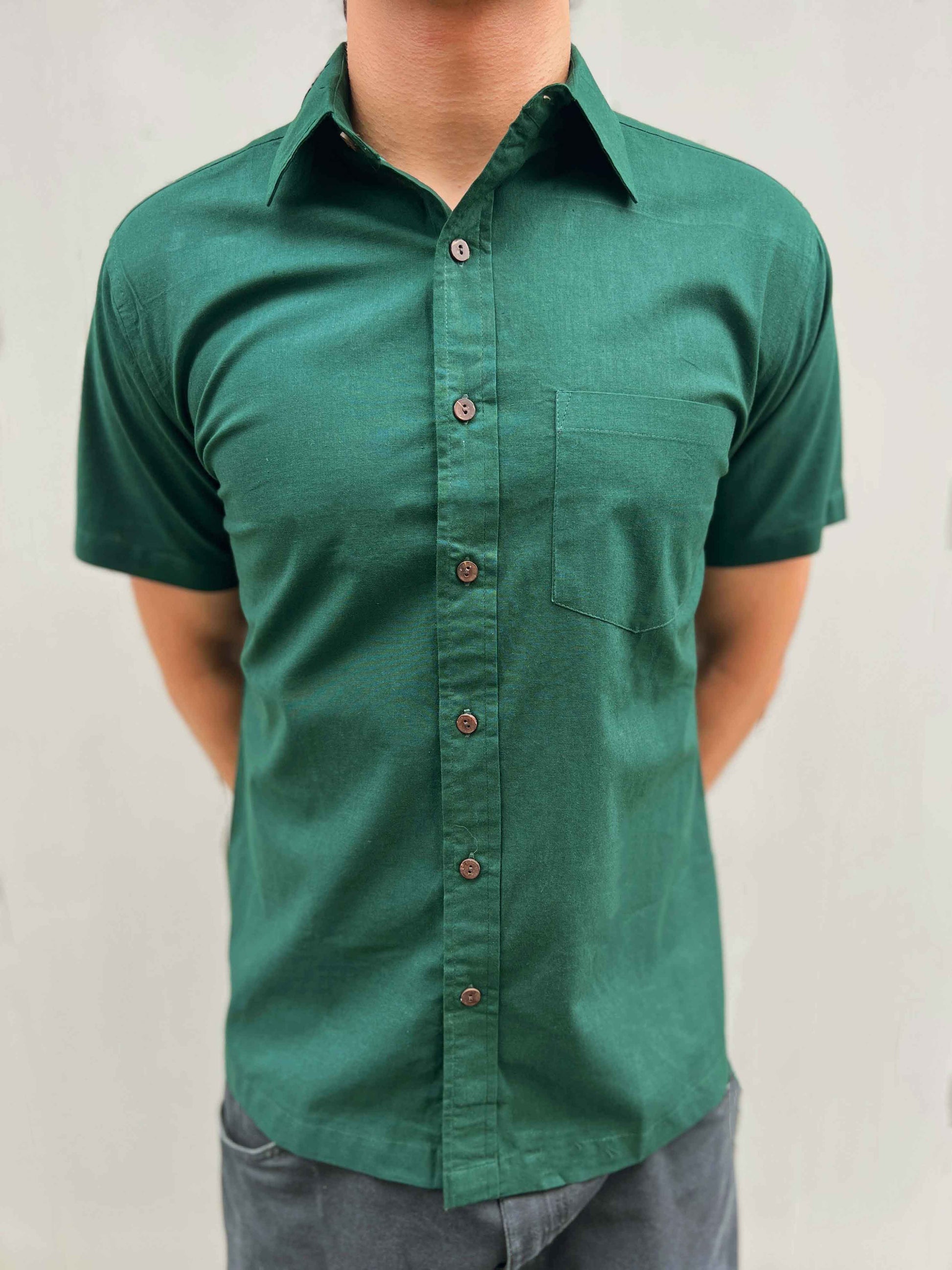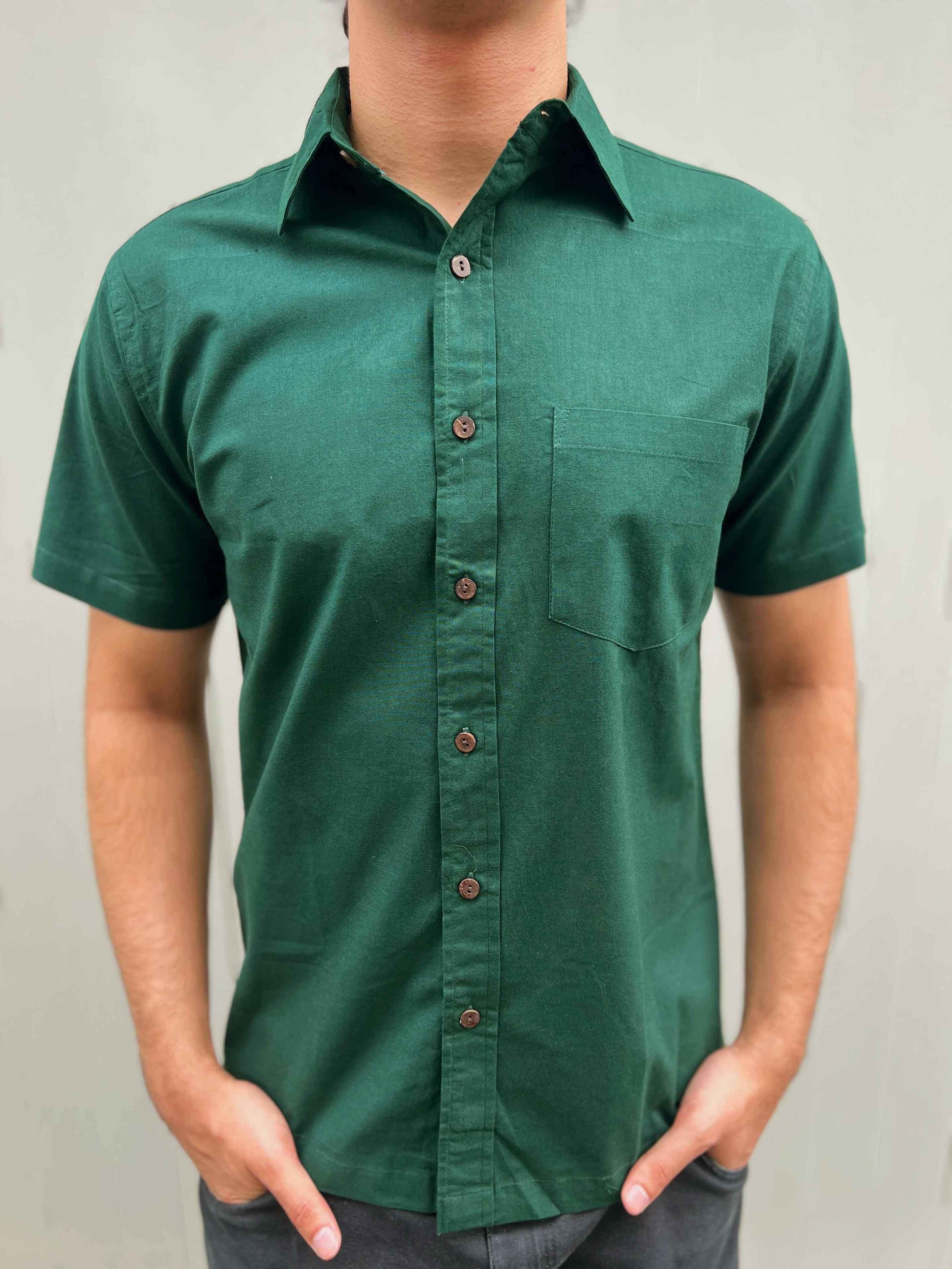 Screen printed short sleeved 100% cotton shirt with dark coconut shell buttons. Deniz is 5' 10" and wears a medium.